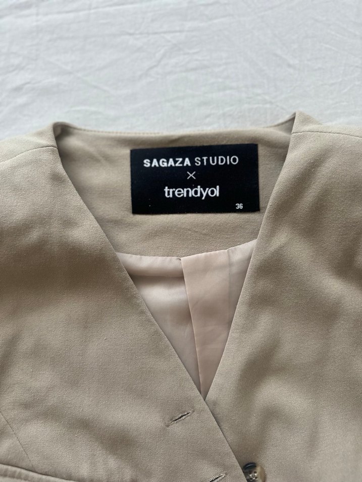 Bej renkli,düğmeli ve V yakalı kadın yelek. Defosu yoktur. Az kullanıldı