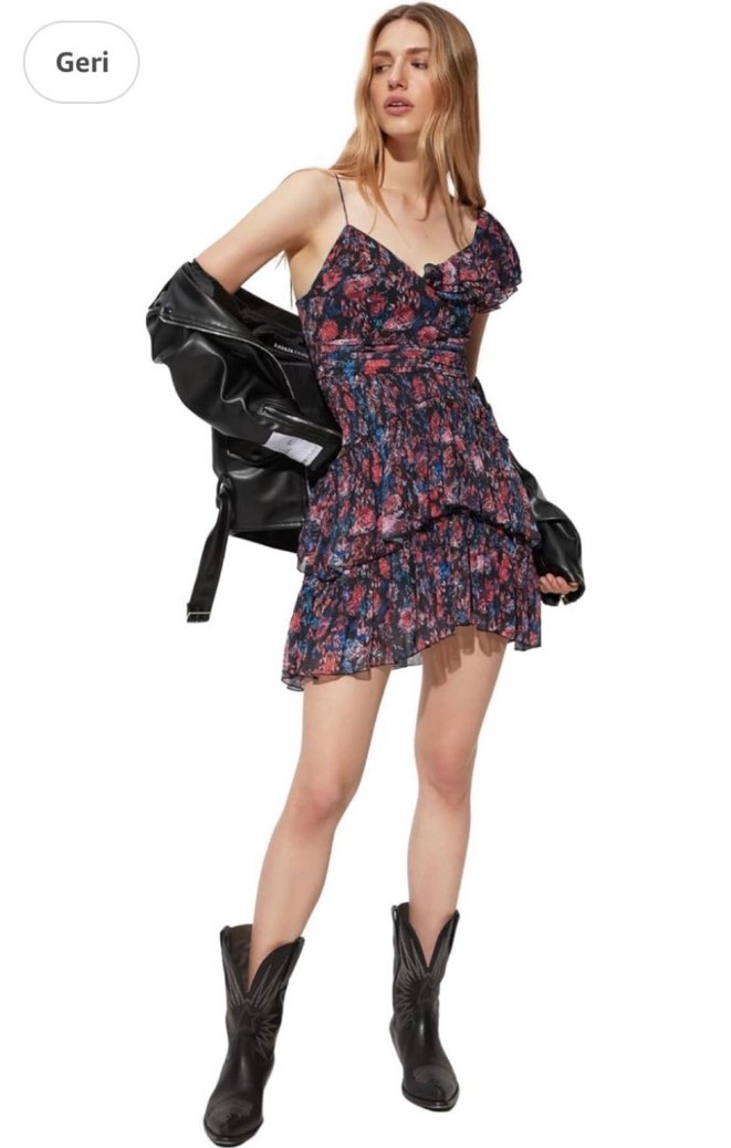 Çiçekli çok renkli koyu tie-dye desenli, tek omuz straplez yaka ve fırfır detaylı elbise.
