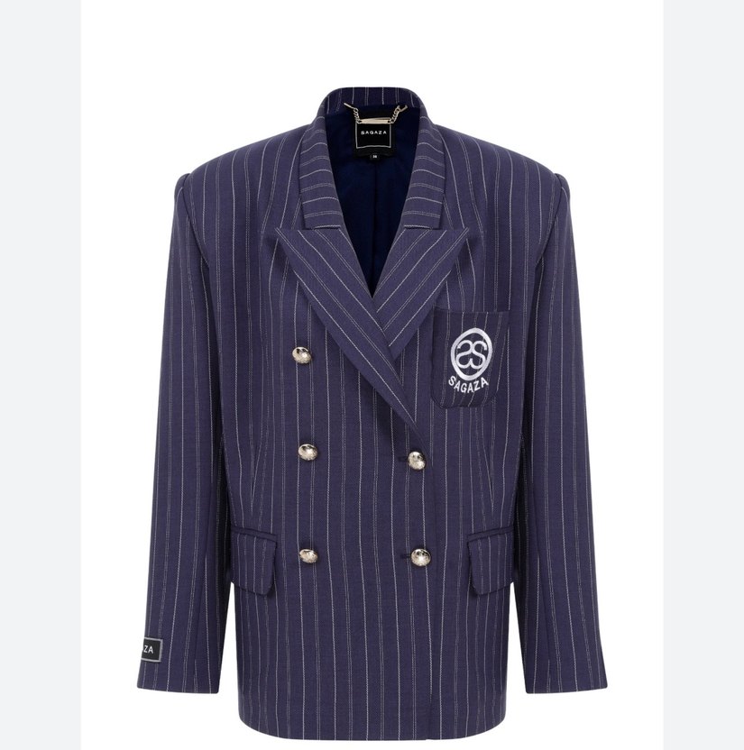 Kruvaze, gold düğmeli, cebi nakış detaylı, omuzları gizli içerden vatkalı, çizgili, lacivert spor şık blazer ceket