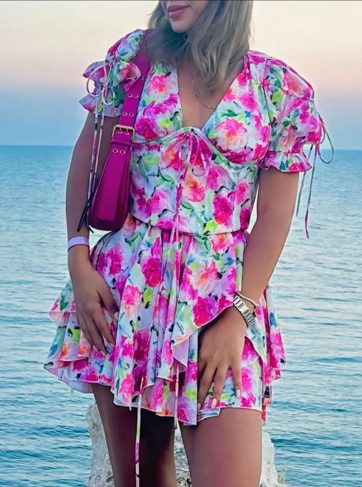 Pembe tonlarında pastel çiçekli, bol kesim mini elbise. V yaka, fırfır detaylı ve askılı kollu, yumuşak sentetik kumaştan günlük bohem stil için uygun.