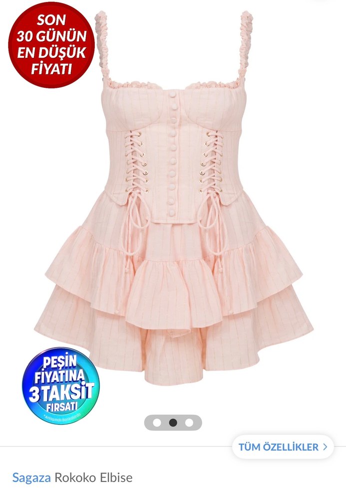 Bu pembe mini elbise, straplez yakası ve volanlı detaylarıyla dikkat çekiyor. Nakış işlemeleri ve ince askılarıyla şık bir görünüm sunar.