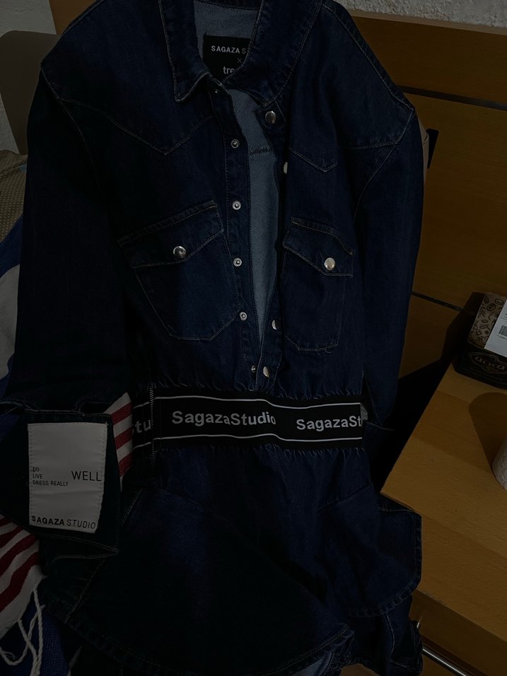 Kemer detaylı, mini ve baskılı desenli koyu mavi kot elbise. Sagaza Studio marka kemerli model.