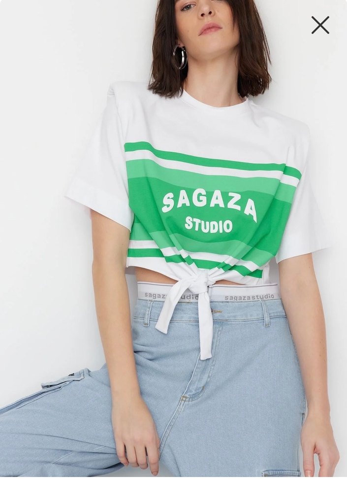 Pamuk kumaştan, kuşaklı ve bağlamalı önüyle salaş kesim, kısa kollu, yuvarlak yaka yeşil-beyaz desenli kadın tişörtü. "SAGAZA STUDIO" baskılıdır.
