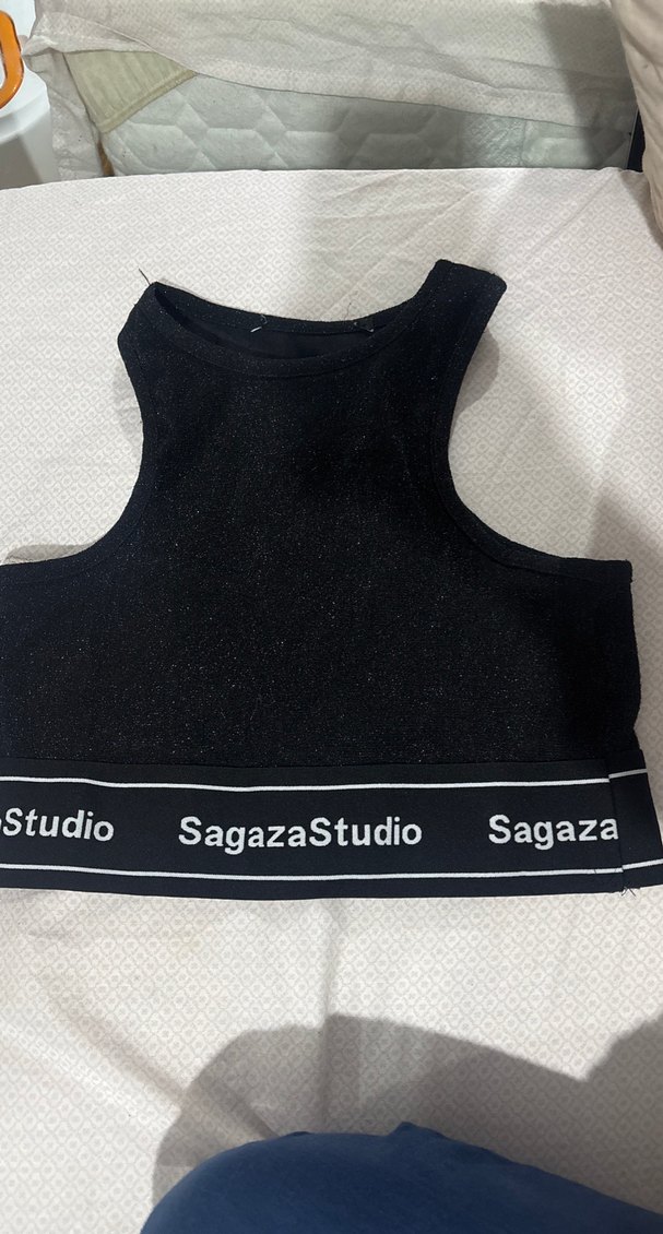 Fitted kesim, siyah crop top, yuvarlak yaka ve kolsuz tasarıma sahip. Sentetik kumaştan, baskılı SagazaStudio logosu ve cırt cırt detaylıdır. Spor ve sokak modasına uygun.