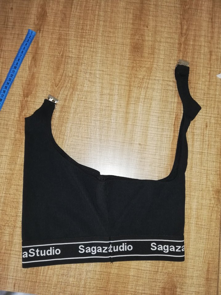 Sagazstudio marka siyah mini sporcu sütyeni, baskılı logo bantlı ve kısa kesim, streetwear tarzında tasarlanmıştır.