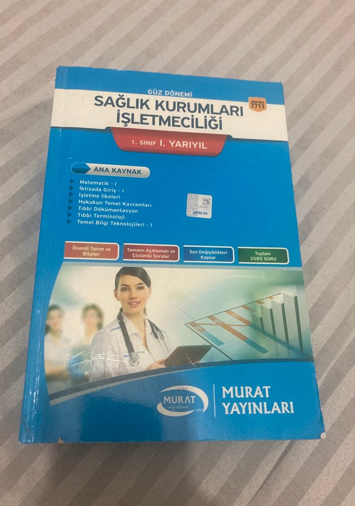 Sağlık Kurumları İşletmeciliği 1. yarıyıl konularını içeren, matematik, iktisat, işletme, hukuk ve tıbbi terminoloji gibi temel bilgileri sunan Murat Yayınları kitabı. Bazı kısımları çözülmüştür.