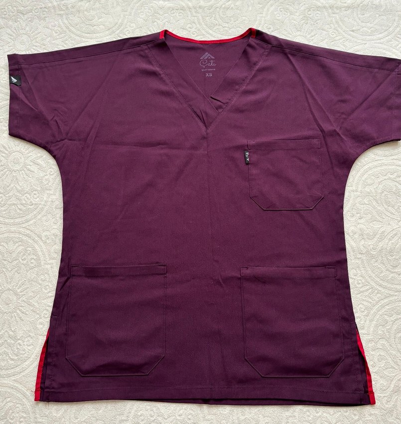 Sadece bir kez giyildi. Herhangi bir sorunu yoktur. Bordo renkli, V yaka ve kısa kollu kadın sağlık personeli üst formasıdır.