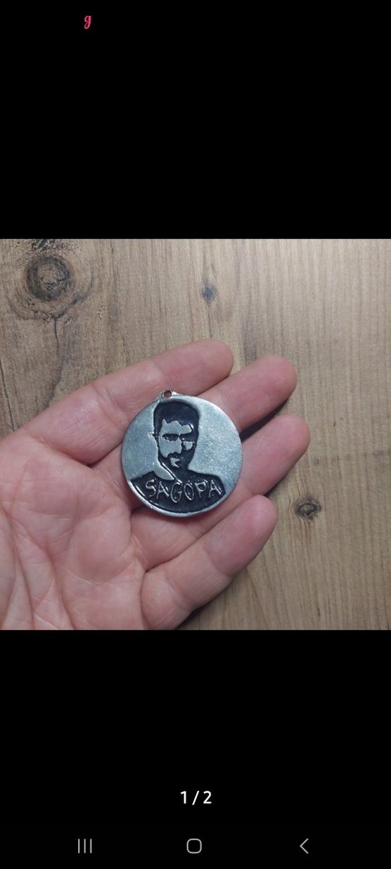 Parlak gri metalden yapılmış, rap tarzında yüz ve 'SAGOPA' yazısı bulunan vintage rozet. Karşı kültür havası yansıtıyor.