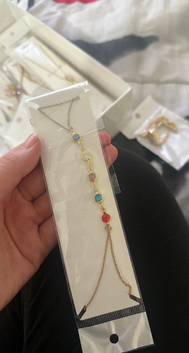 Bohem tarzda, renkli taş detaylı ince altın tonlu zincirden oluşan kadın el zinciri, günlük kullanım için minimal bir şıklık sunar.