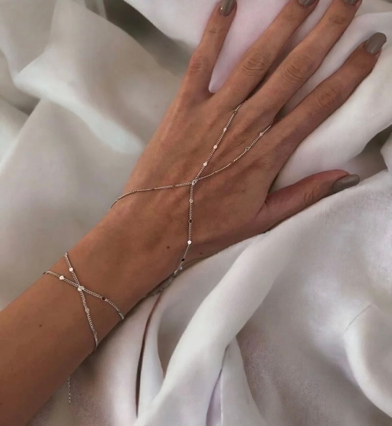 Bohem ve minimalist tarzda, zincir detaylı bej kadın el zinciri. Düğün gibi özel anlar için uygun, desensiz ve hafif tasarım. ✨