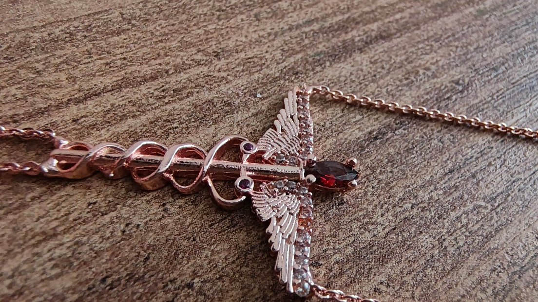 fotpgrfata tam çıkmamış fakat rengi rose gold şahmeran ince detaylı zincir ve kanatlı kolye ucu koyu kırmızı taşlarla süslenmiştir. Nakış deseniyle benzersiz bir görünüm sağlar.