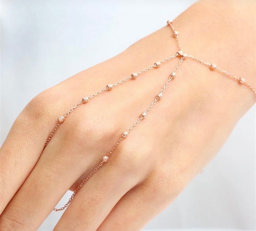 Boncuklu, minimalist bohem tarzda bej renk kadın el zinciri. Günlük kullanıma uygun, şık ve sade tasarım.