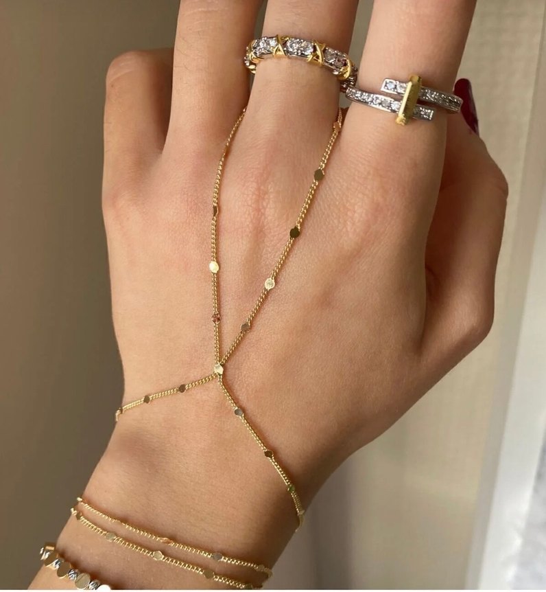 Altın renginde, zincir detaylı, minimalist ve bohem tarzda kadın el zinciri. Günlük kullanım için uygun, hafif retro dokunuş katıyor.
