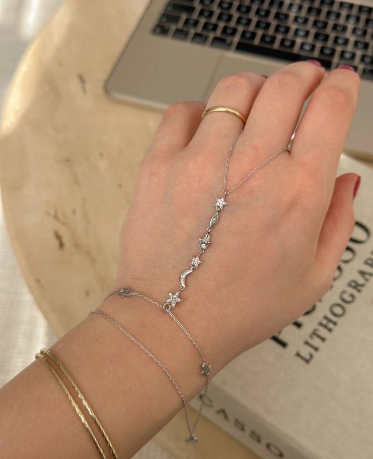 Gümüş renkli, zincir detaylı ve küçük yıldız ile ay figürlü nazik el zinciri. Minimalist, bohem tarzda, günlük kullanım için uygundur.