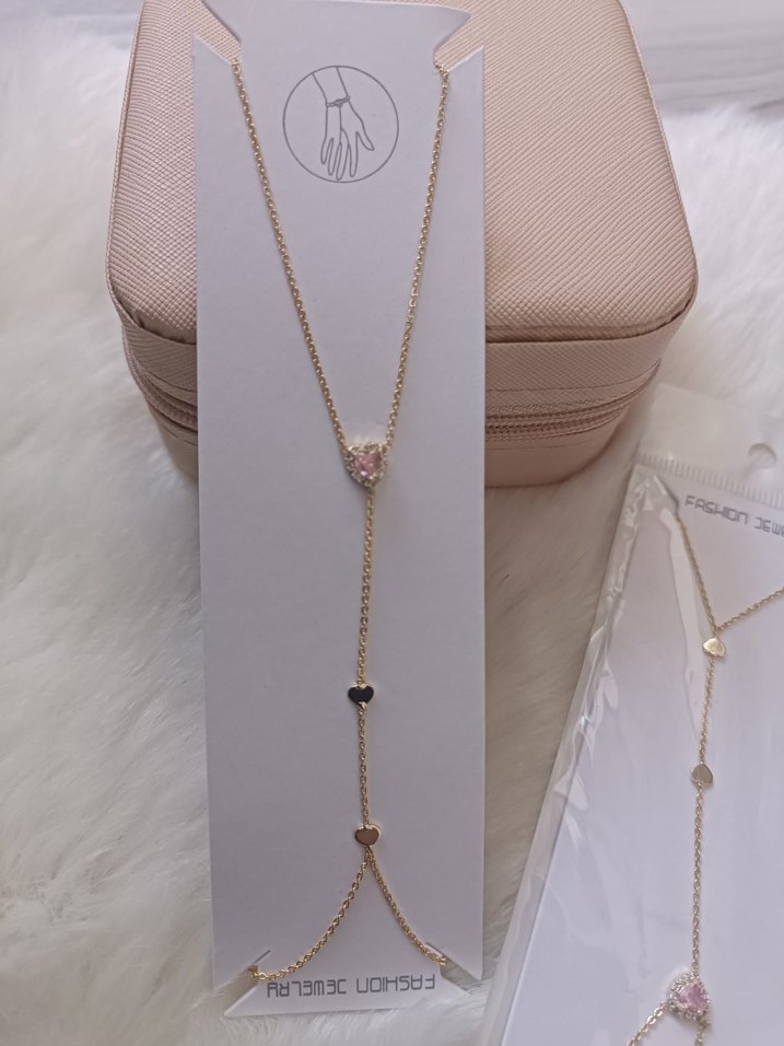 Altın renkli, zincir detaylı ve küçük kalp figürlü kadın el zinciri. Minimalist ve bohem tarzda, romantik akşamlar için uygun.