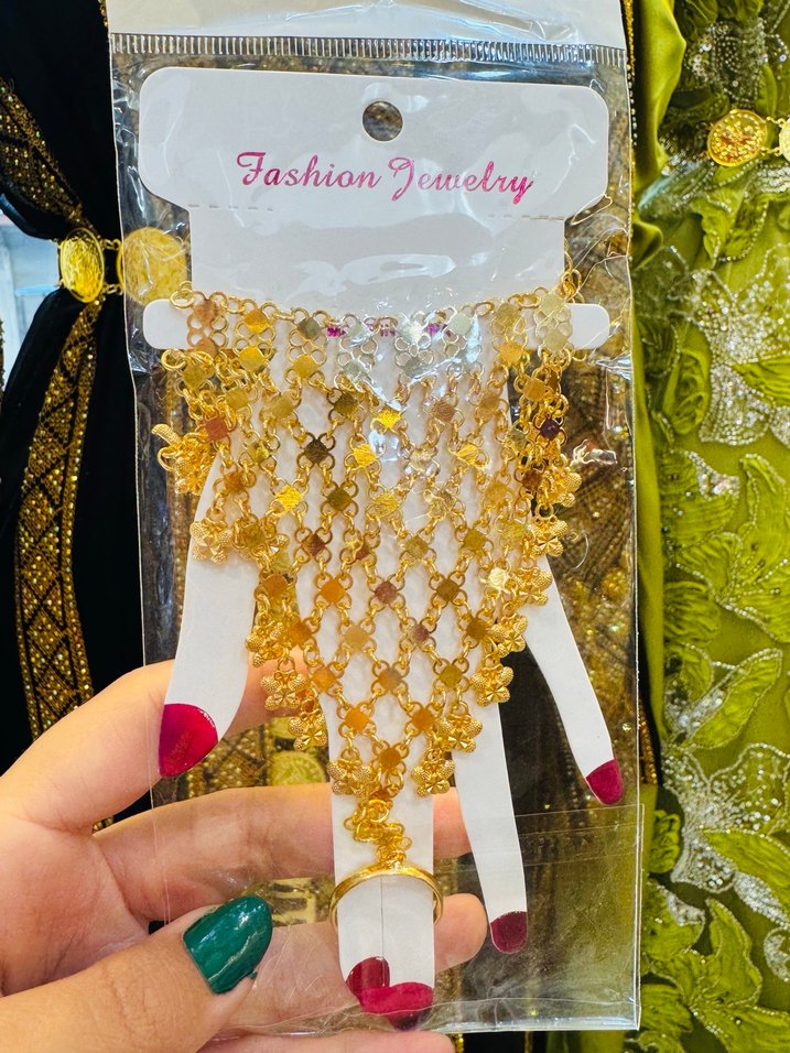 Altın renkli, zincir detaylı ve desenli kadın el zinciri. Bohem tarzda, düğün ve özel günler için uygundur. ✨