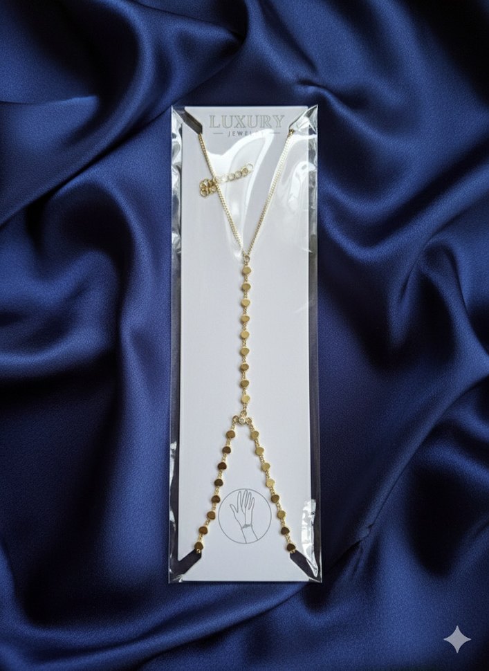 Zincir detaylı, parlak altın renkli el zinciri. Günlük kullanıma uygun, çağdaş tarzda, bohem ve gösterişli bir dokunuş sunar. ✨