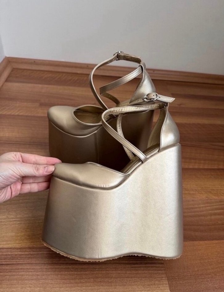 Hiç giyilmedi sıfır ürün herhangi bir sıkıntısı yoktur ürün hafif bir üründür. Topuk boyu 18 cm Platform 10,5 cm Platform Ayakkabı Yüksek topuk ayakkabı Abiye Ayakkabı Gold Ayakkabı Altın Ayakkabı Sahne Ayakkabısı