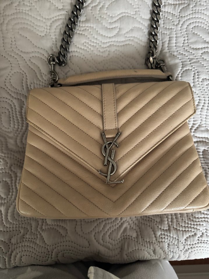 Bej deri, zincir detaylı, klasik YSL logosu bulunan ve günlük kullanıma uygun çağdaş Paris tarzında kadın çantası.