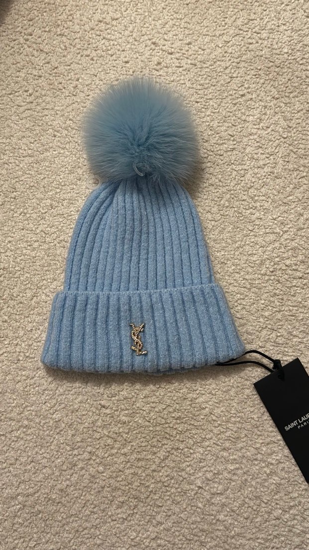 Saint Laurent markalı, örme pastel mavi kumaştan yapılmış, üstünde yumuşak ponpon ve metalik logo detayı bulunan kadın bere.
