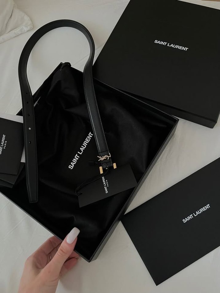 Saint Laurent'in siyah deri kemerli çantası, baskılı logo deseniyle çağdaş stil ve günlük kullanım kolaylığını bir araya getiriyor.