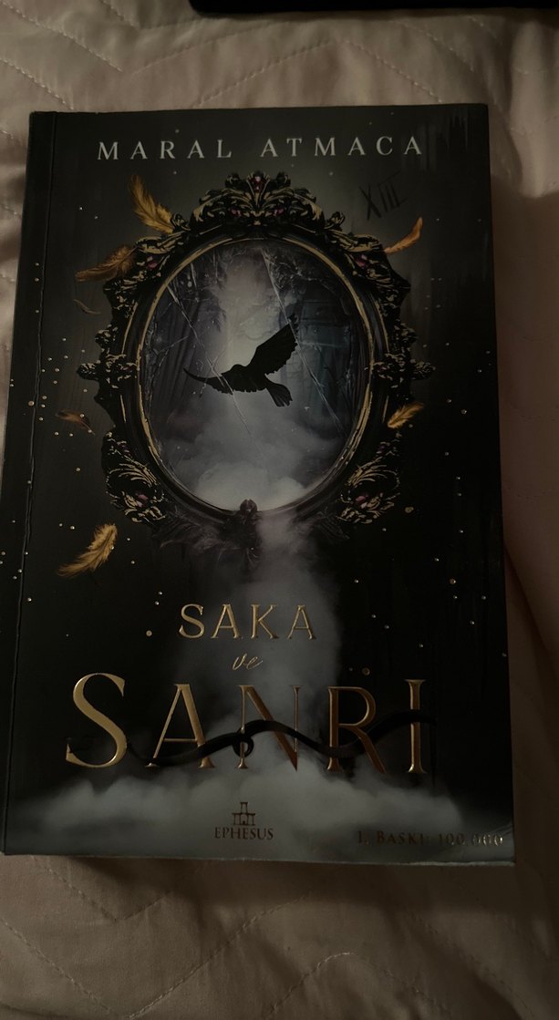 Maral Atmaca'nın "Saka ve Sanrı" adlı romanı, gizemli ve mistik bir atmosfer sunan, süslü çerçeve içinde karga silueti bulunan koyu kapak tasarımına sahiptir. Ciltsiz