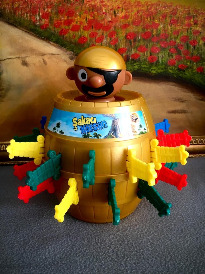 Şakacı Korsan. Eksik kılıç yoktur. Fırlatma mekanizması çalışıyor.Kutusu yoktur. Altın renkli korsan fıçısı, içine renkli kılıçlar takılarak oynanan eğitici ve renkli bir oyuncaktır.