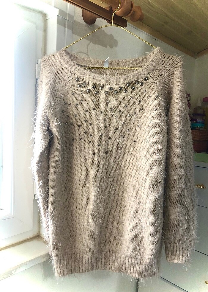 Sakal yününde kazak salaş standart beden ama m-l beden rahat giyilebilir hiç bir kusuru yoktur Metal süslemeleri mevcuttur çok sağlamdır