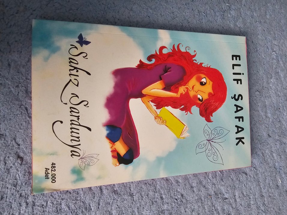 Sakız Sardunya adlı çocuk kitabı, kırmızı saçlı bir kızın sarı bir kitap okuduğu illüstrasyonla kaplanmıştır. Kapakta kelebekler ve yumuşak renkler yer alır.