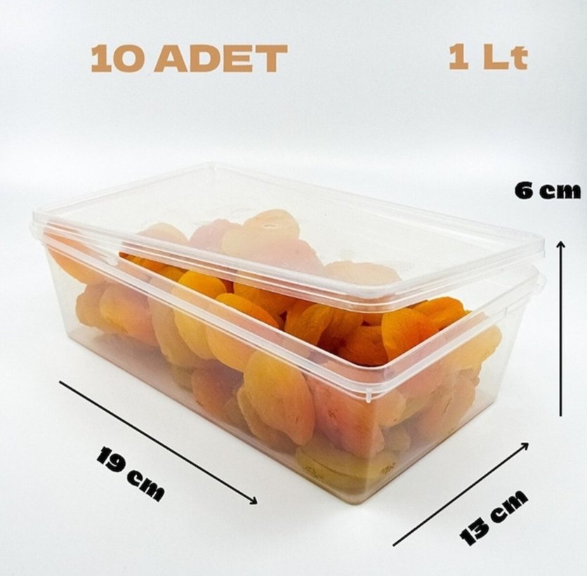 10 adet, 19x11 cm ölçülerinde, şeffaf kapaklı yiyecek saklama kapları seti.