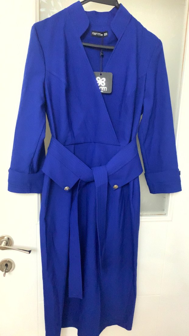 saks mavi kumaştan, 3/4 kollu, bele oturan kadın klasik uzun elbise. Kemer detayı ve desen içermeyen tasarımı ile iş ortamına uygun.