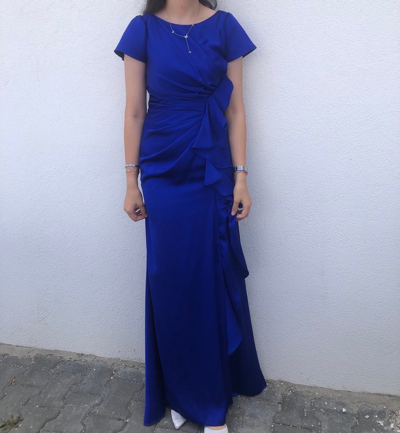 Saks mavi uzun abiye elbise, tekne yaka ve drapeli tasarımıyla modern klasik bir görünüm sunar. Düzenli kesim ve ince askılıdır, düğünler için uygundur. Parlak, desensiz kumaşı ışıltı katar.