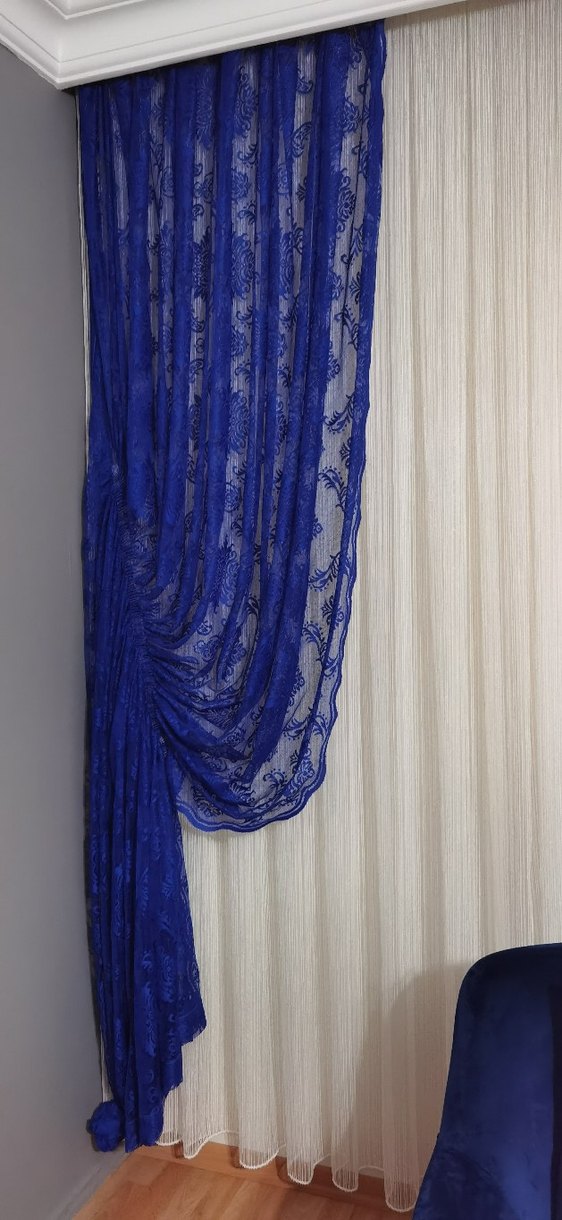 Sax mavi bohem bağlamalı tül fon perde, hafif ve şeffaf kumaşıyla dekoratif bir görünüm sunar. Ikiser tane karsilikli 4 kanat mevcut. Iki kanat fiyati 600 tl