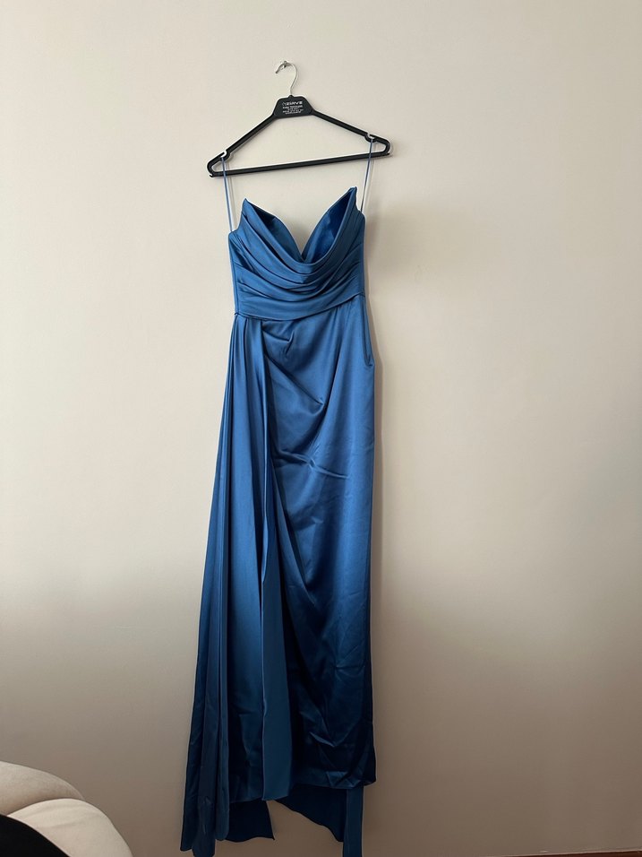 Saks mavi, göğüs kısmı drapeli, içi kısa yırtmaçlı üstü uzun ve straplez abiye elbise. Üst kısmı vücuda oturan, alt kısımı uçuş uçuş kesimiyle düğünler için uygun, minimal ve çağdaş tarzda.