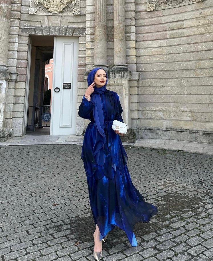 Uzun, bol kesim elbise; hakim yakalı, uzun kollu,şifon kumaş ve koyu mavi batik desenli, drapeli detaylara sahip. Düğün ve sokak stiline uygun. 1 beden (36-38 uyumludur) ürün şifon kumas olduğundan dolayı ufak tefek çekmekler olmustur