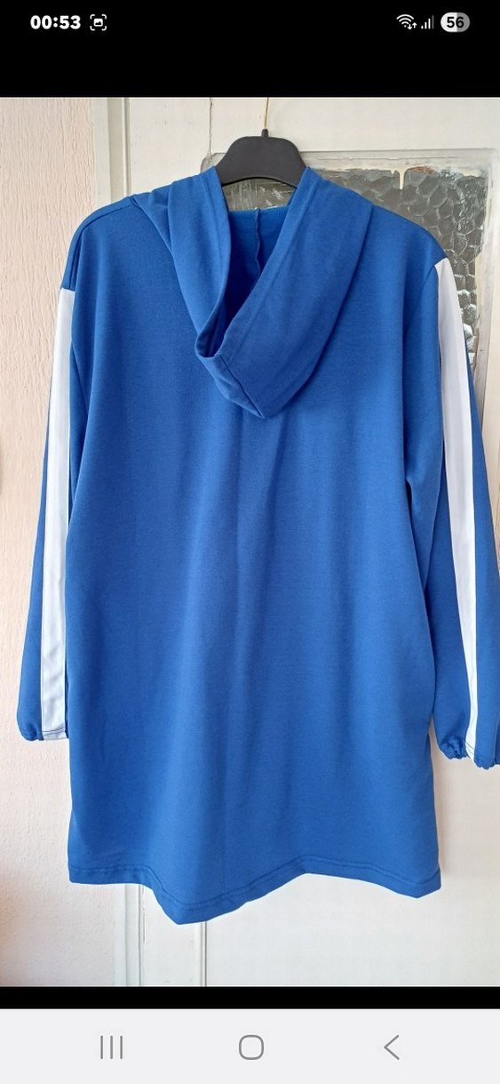 Parlak saks mavi renkte, kapüşonlu ve fermuarlı cepli Spor Rahat kesim, midi boy ve uzun kolludur. Yumuşak, sıcak tutan kumaştan üretilmiştir. üst fermuarlı cekedi ve pantolonu lastikli dir beyaz kalın biyeli takımdır