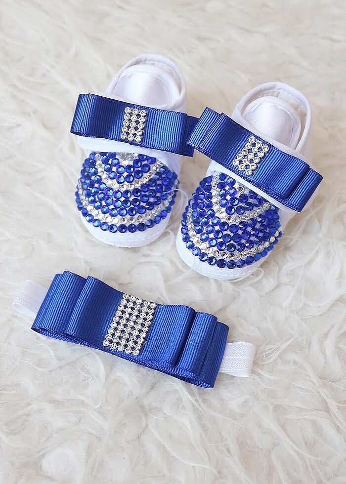 Saks mavi renk taşlı patik papyon seti