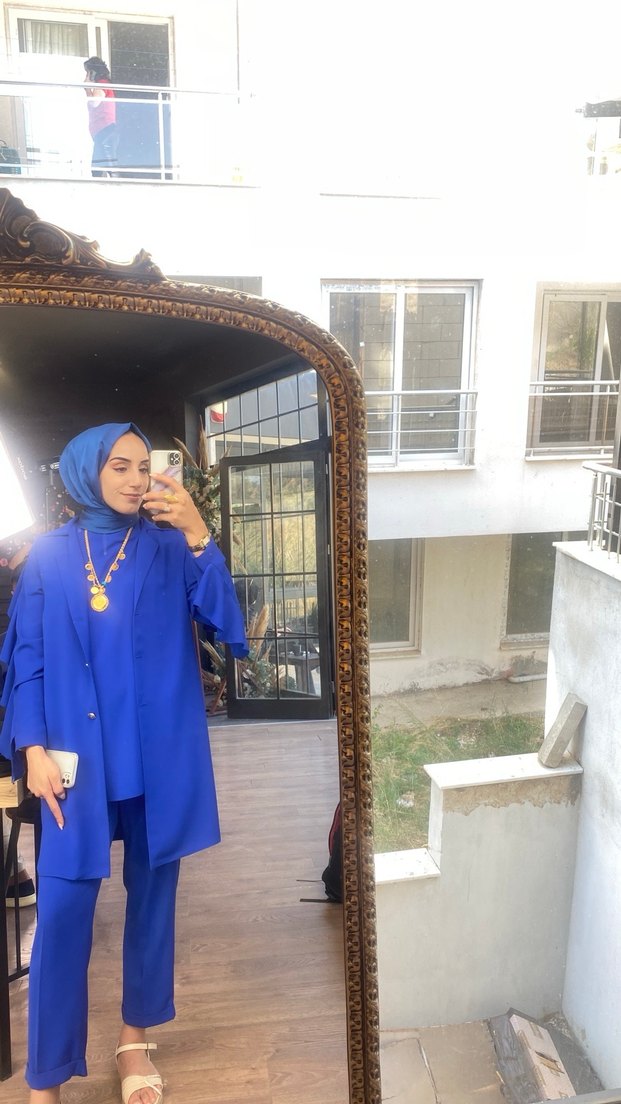 mavi kadın takımı. Uzun kollu ve günlük iş stili için uygundur.