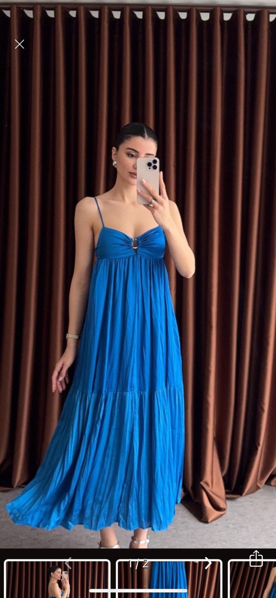 Mavi, askılı detaylı, pilili ve bol kesim, ipeksi kumaştan uzun bir elbisedir. Parlak deseniyle bohem tarzını yansıtır. Marka temsili