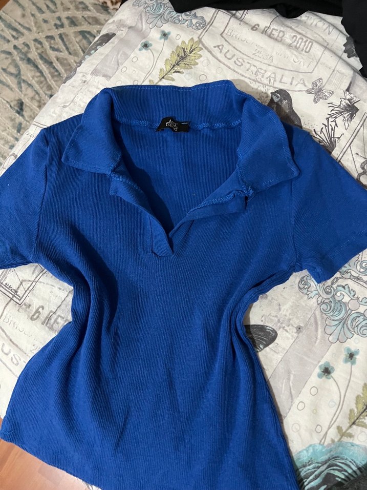 Keten kumaştan yapılmış, yakalı ve kısa kollu, düğmeli, lacivert renkli, dar kesim kızlar için polo tişört. Sokak stiline uygun.