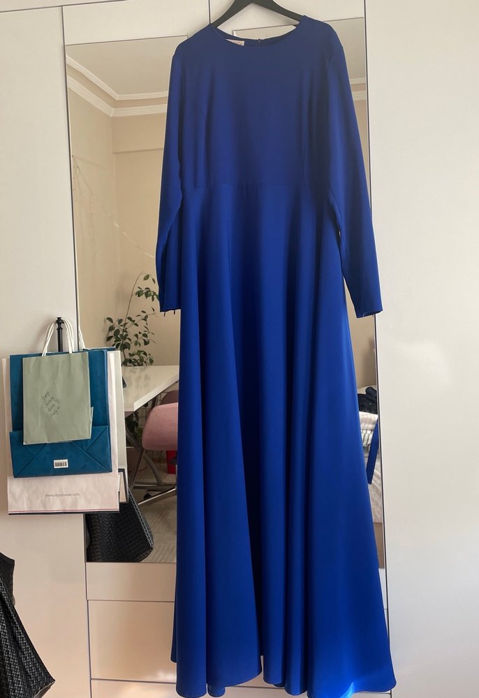 Uzun, bol kesim arkası ve kolları fermuarlı istediğinde takıp çıkarılabilen bağlamalı taşlı kemeri mevcut 2 kere kullanıldı temizdir içi astarlıdır 44-46 beden uyumludur