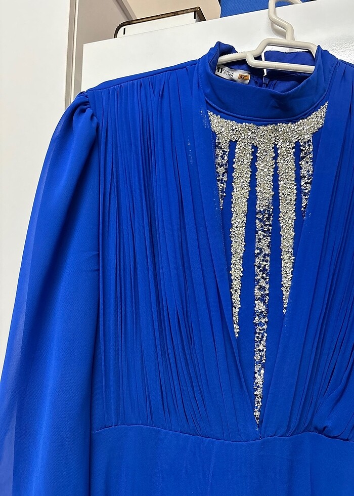 Saks Mavisi Şifon Taşlı Tesettür Abiye