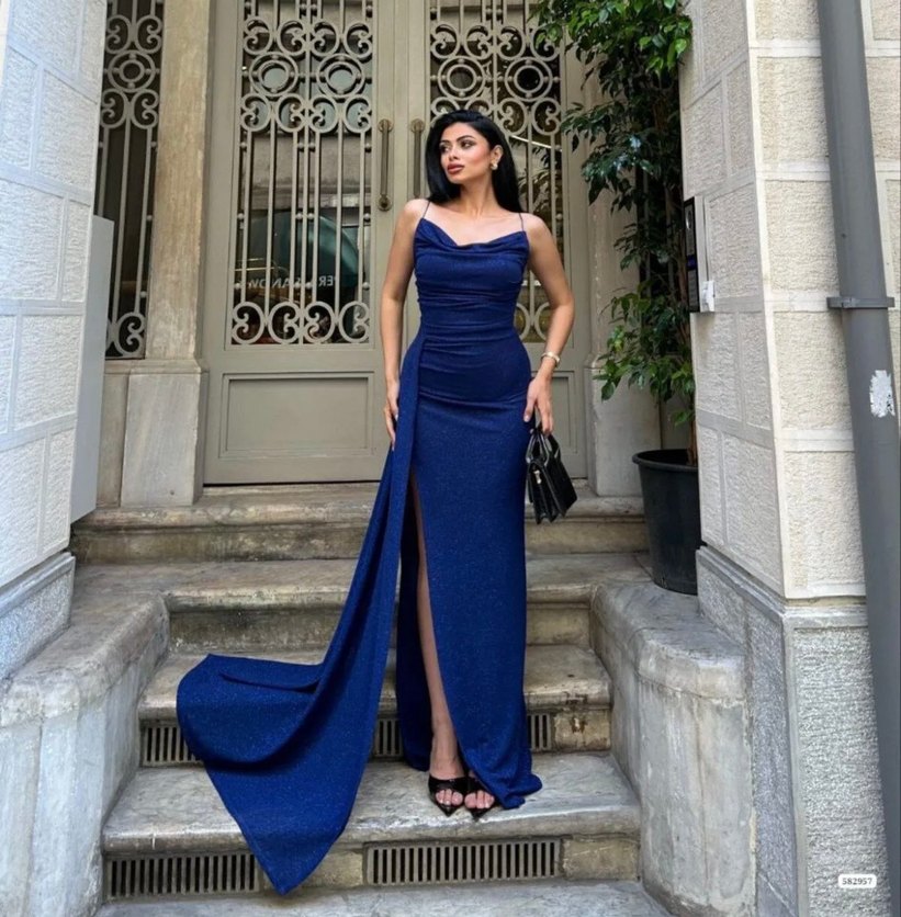 1 kez düğünde giyildi. Üründe tadilat vardır almadan önce sorunuz. Saks mavisi, simli, fukuro kumaş, çok rahat. Drapeli ve ince askılı uzun abiye elbise. Parlak kumaşı ve yırtmaç detayıyla düğün ve özel günler için uygundur.