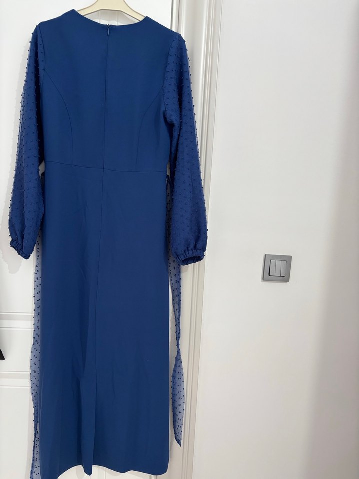 saks mavisi Uzun Kollu Uzun Abiye Elbise