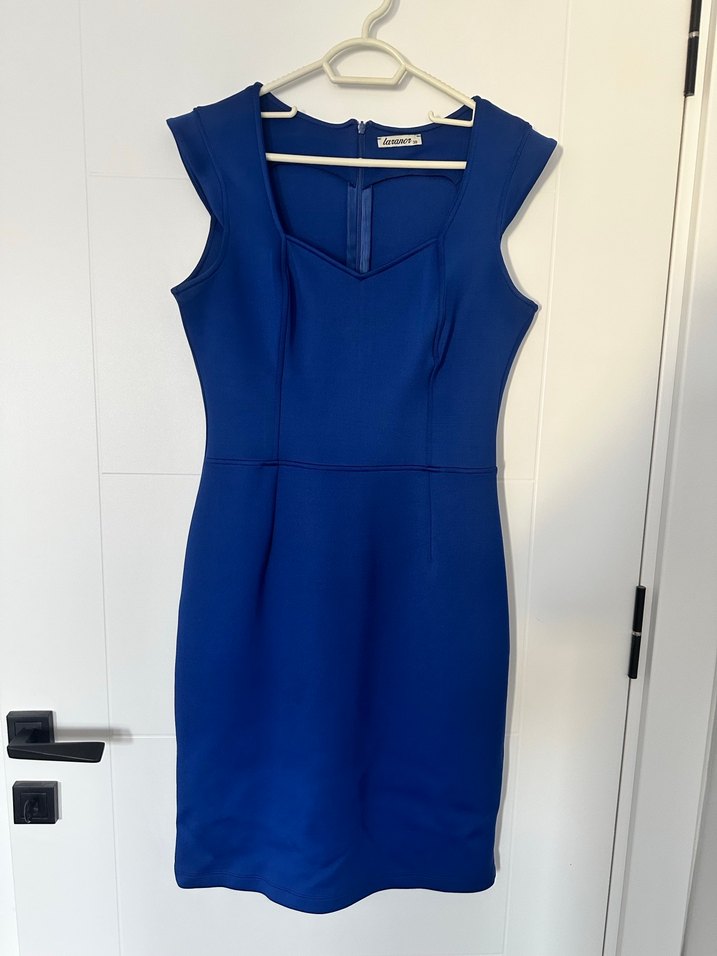 Saks Mavi, v yaka ve kolsuz, diz boyu oturan elbise. Esnek kumaştır. Parlak dokusu ve modern klasik tarzıyla ofis ve özel günler için uygun. ✨