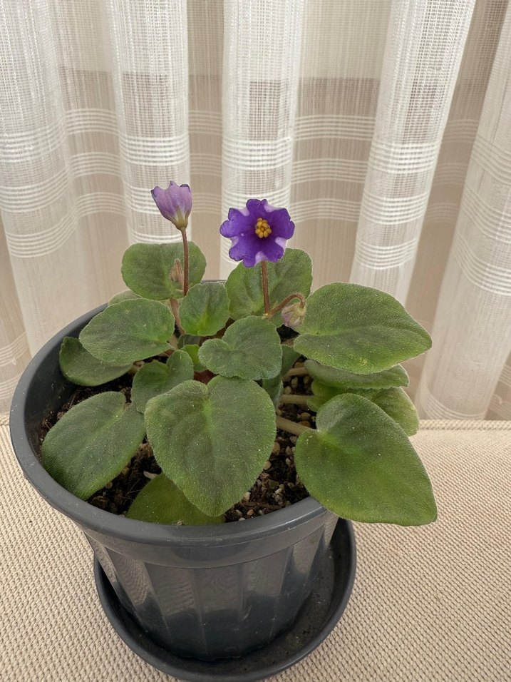 Yeşil yapraklı ve küçük mor çiçekli Afrika menekşesi, tül perde önünde saksıda yer alıyor.