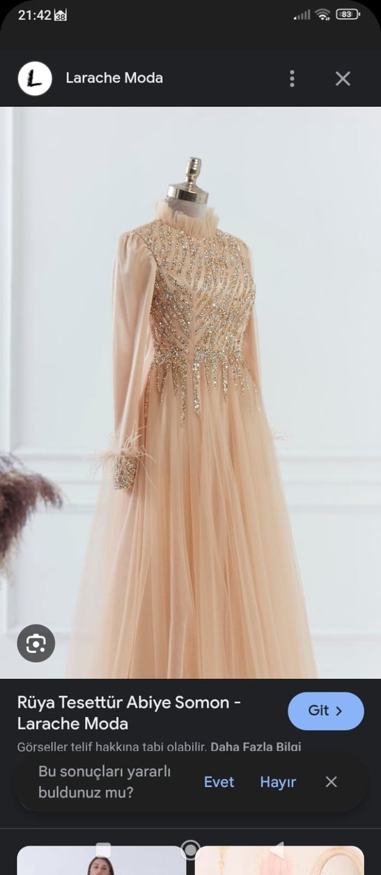 Bej renkli, yüksek yakalı ve işlemeli detaylara sahip uzun kollu, drapeli abiye elbise. Düğünler için uygundur. ✨