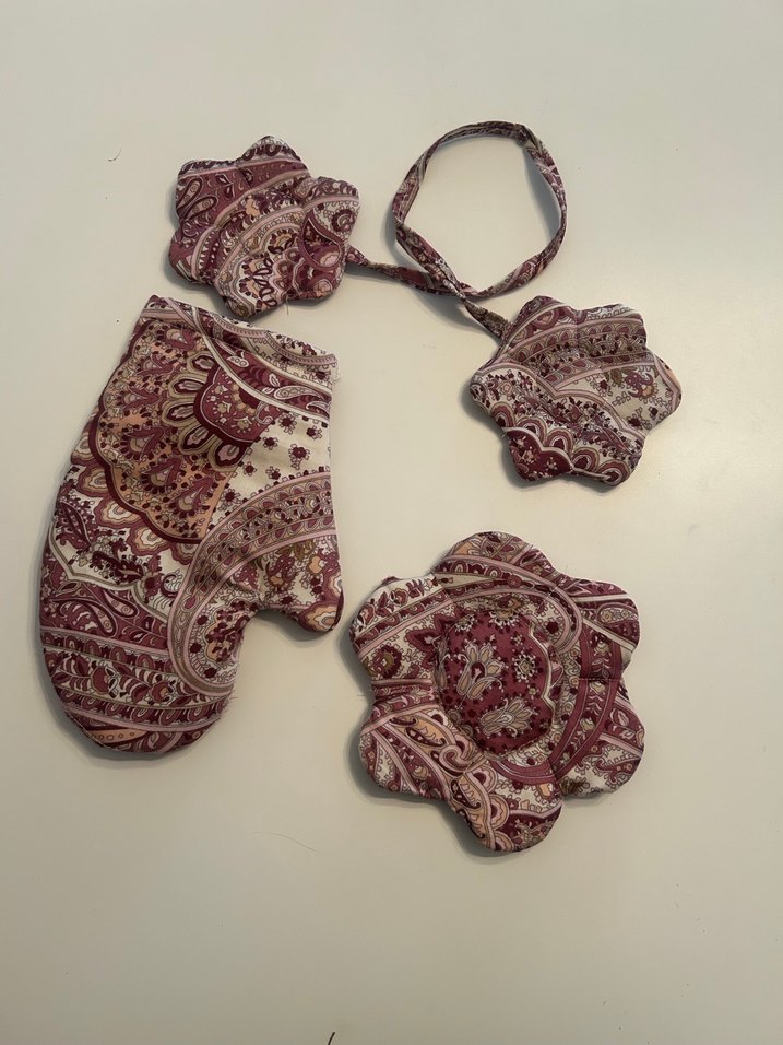 Bordo renkli, nakışlı desenlere sahip fırın eldiveni seti. İçinde eldiven ve uyumlu tutacaklar bulunur.