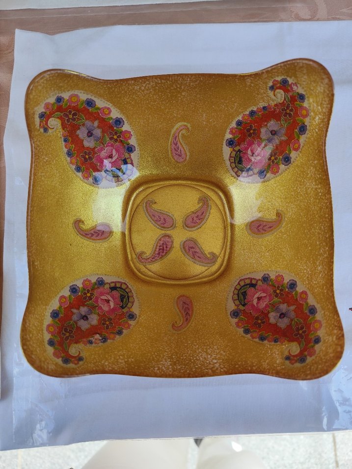 Şal desenleriyle süslenmiş altın renkli parlak kare cam tabak 19x19 cm ebatlarında El boyaması ✨