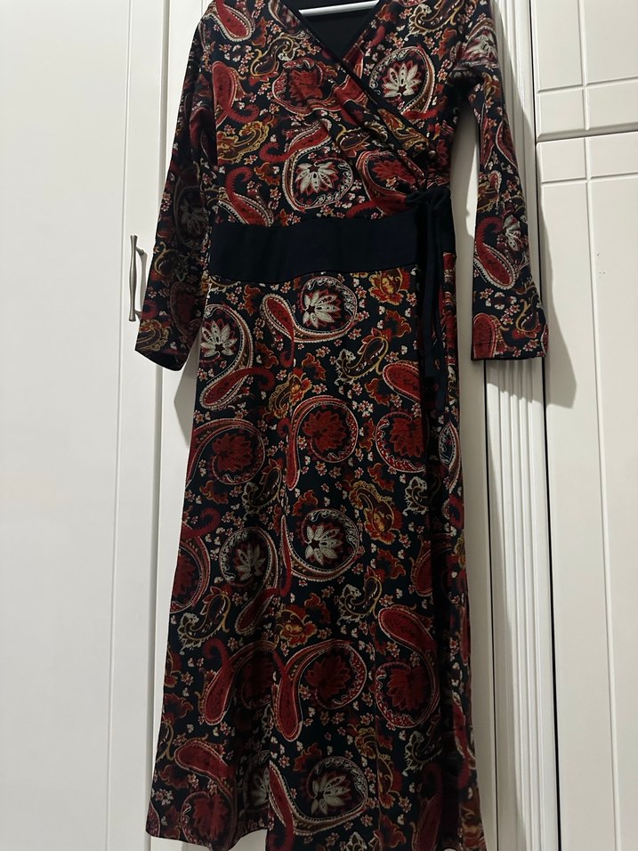 Bordo şal desenli renkli, uzun ve drapeli, bohem tarzda desenli elbise. Yüksek yakalı ve uzun kolludur, vücuda oturan bir kesime sahiptir.